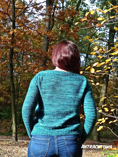 Technicznie: pomysł mój, druty 2.75 na całość i 2 na ściągacze, włóczka Stenli Len 100g/300m zużyte trochę ponad 2 motki czyli jakieś 220-230g (całkiem fajna mieszanka 30% wiskoza 50% bawełna 20% len, trzeba trochę uważać przy przerabianiu żeby się między nitki nie wbijać, ale nosi się dobrze chociaż trochę gniecie, mniej sznurkowata niż czysty len bardziej jak bawełna choć minimalnie bardziej szorstkie przed praniem, ładnie błyszczy dzięki wiskozie i kolor nie jest płaski, po blokowaniu trzyma kształt).